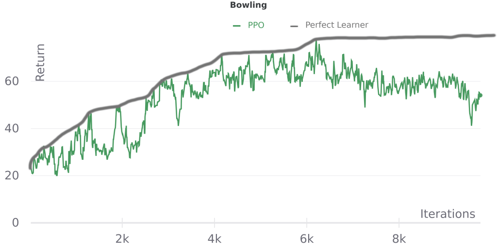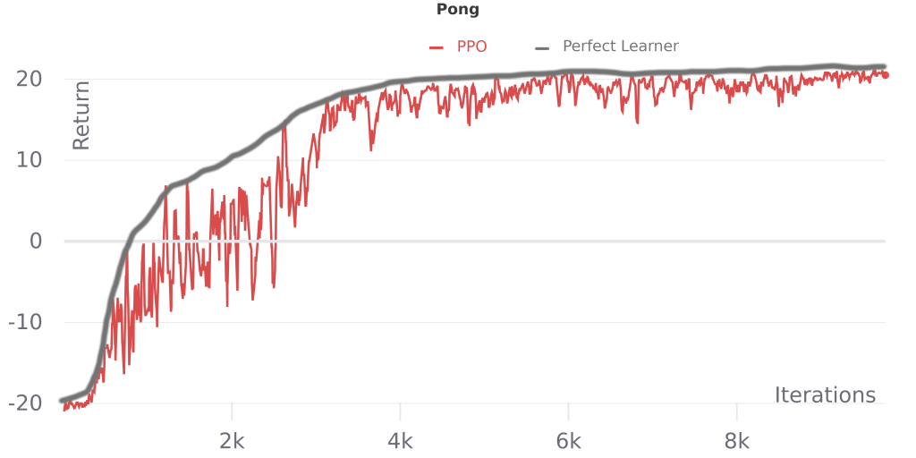 ^ The PPO line in these plots shows the mean of the last 10 episodes, so the area under the perfect learner curve should be slightly larger, though the relative shapes of the two curves will be unchanged. This estimate also doesn’t account for run-to-run variance due to sampling, so ideally we’d average perfect learner performance across multiple runs.