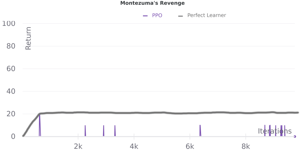 We can see that PPO is close to monotonic on Pong, which tracks with the general observation that most algorithms that build upon A2C/PPO don’t perform significantly better on this game. Meanwhile on Bowling PPO has more performance drops and it even declines late in training, consistent with recent work addressing the challenges caused by delayed rewards in that game. On Montezuma’s Revenge, we see that returns are mostly zero, and even a perfect learner would not perform well (returns can go much higher than 100), which fits with the idea that better sampling (exploration) is important for this game.